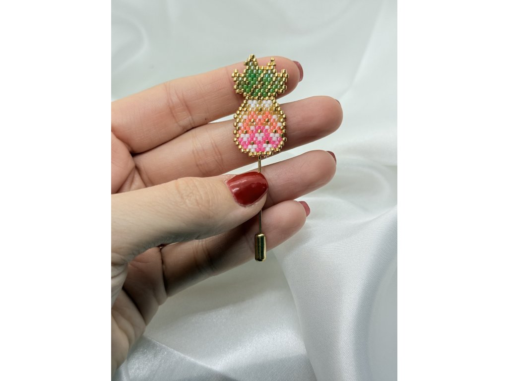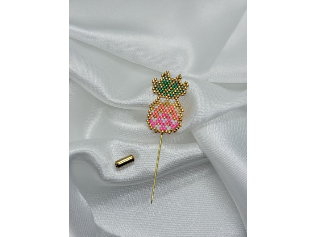Brožový špendlík s motivem barevného ananasu je perfektním spojením hravosti a elegance. Design v růžových, bílých a zlatých tónech přináší veselý a svěží akcent, který okamžitě oživí váš outfit. I přes svou hravost zůstává špendlík velmi elegantní, ideální pro ty, kdo chtějí přidat kousek originality a šmrncu do svého stylu.