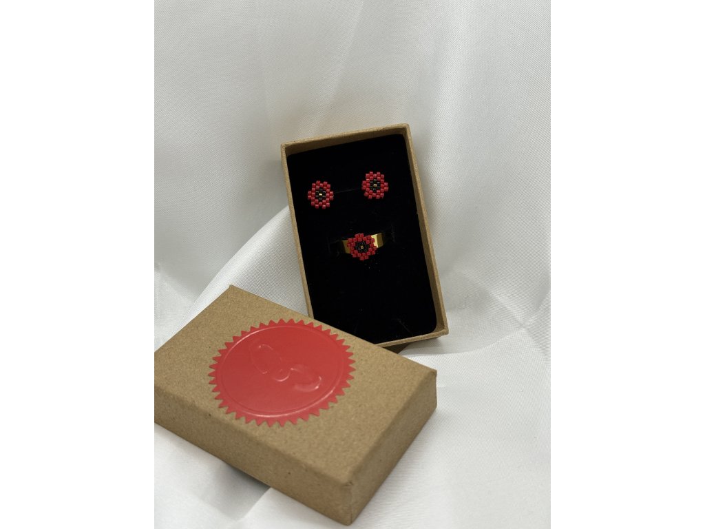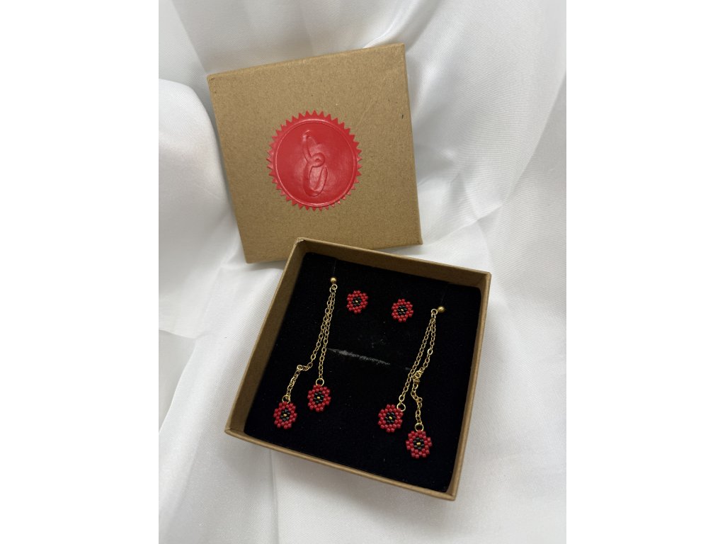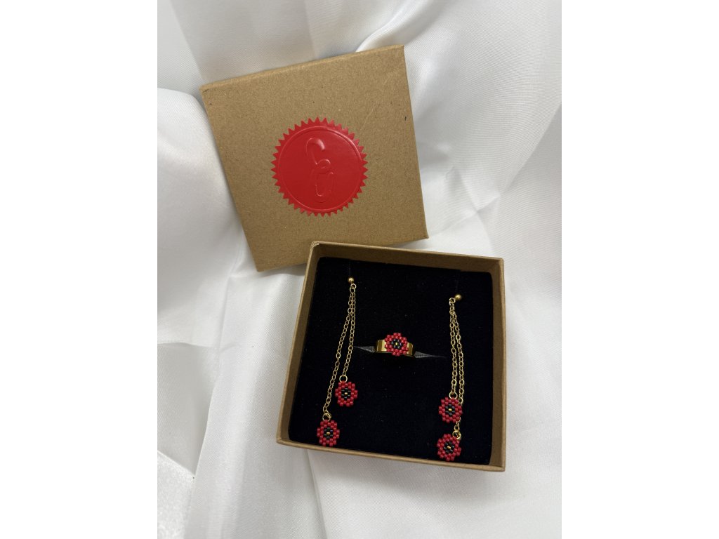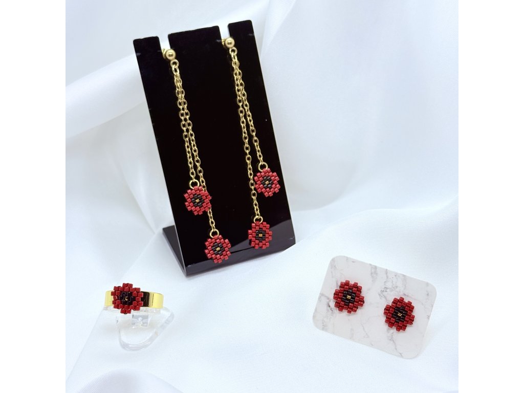 Přesně touto energií je prodchnutá i kolekce Vlčí máky, ručně vyrobená z japonských korálků Miyuki známých pro svou preciznost a stálost barev, a doplněná chirurgickou ocelí ve zlaté barvě, která je hypoalergenní a nadčasově elegantní.