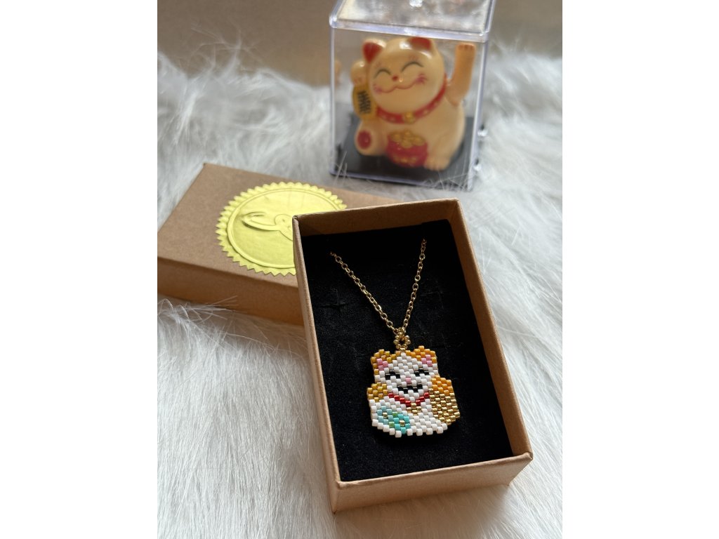 Jemný a hravý řetízek s přívěškem bílé kočky Maneki neko potěší každého, kdo věří na malé talismany s velkou silou. Přívěšek je lehký, elegantní a krásně vynikne na krku. Je ručně šitý z prestižních japonských korálků miyuki.