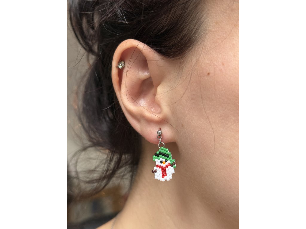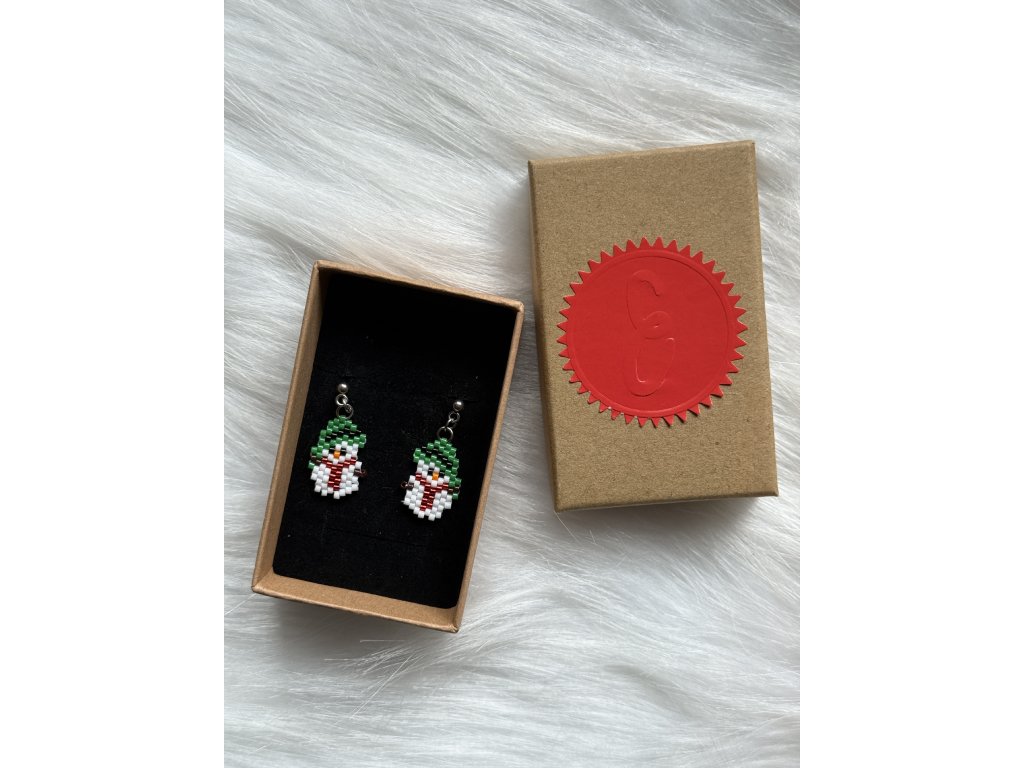 Roztomilé ručně šité náušnice se vzorem sněhuláka s červenou šálou a zelenou čepicí rozzáří každý zimní den hravým a veselým motivem. Precizní zpracování z drobných korálků zajišťuje jemné detaily a výrazný vzhled. Zapínání tvoří afroháček z chirurgické oceli, který je pohodlný a šetrný k uším.