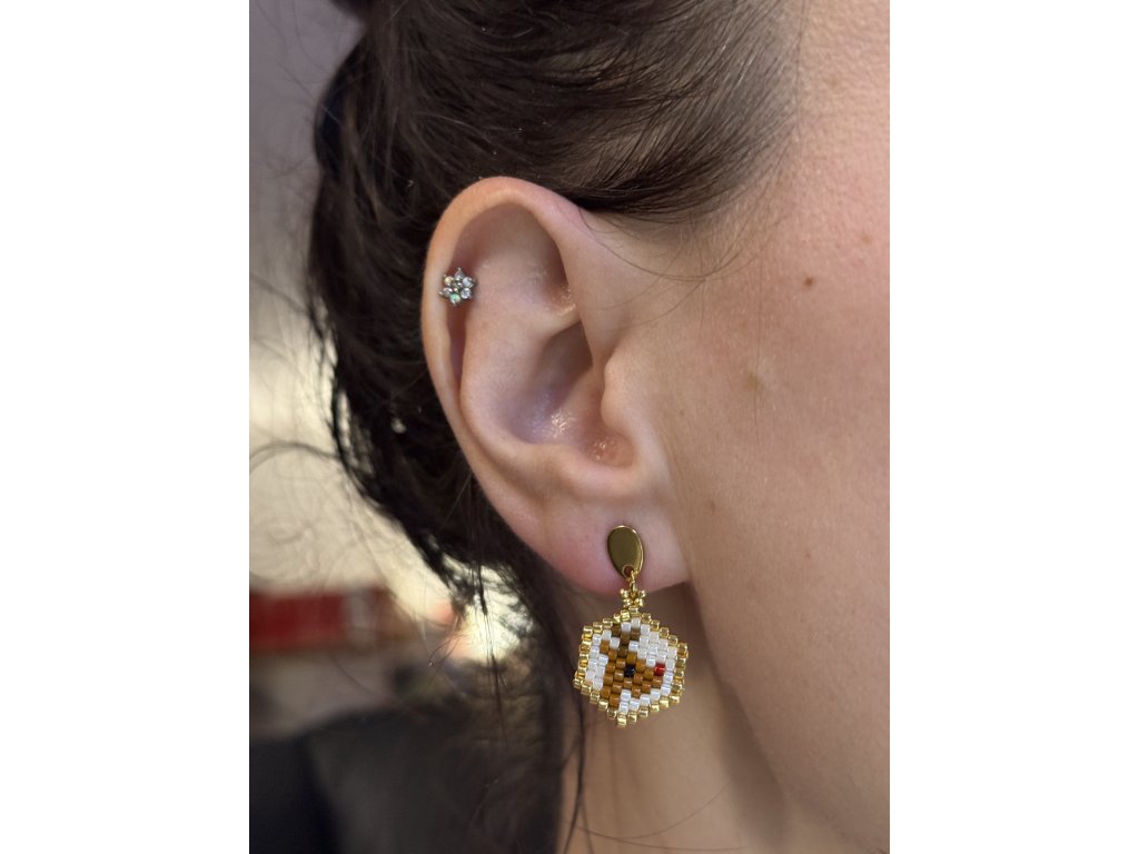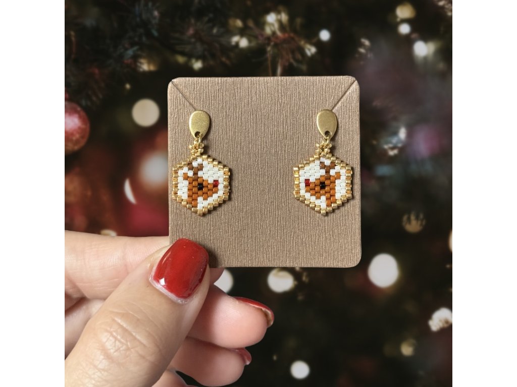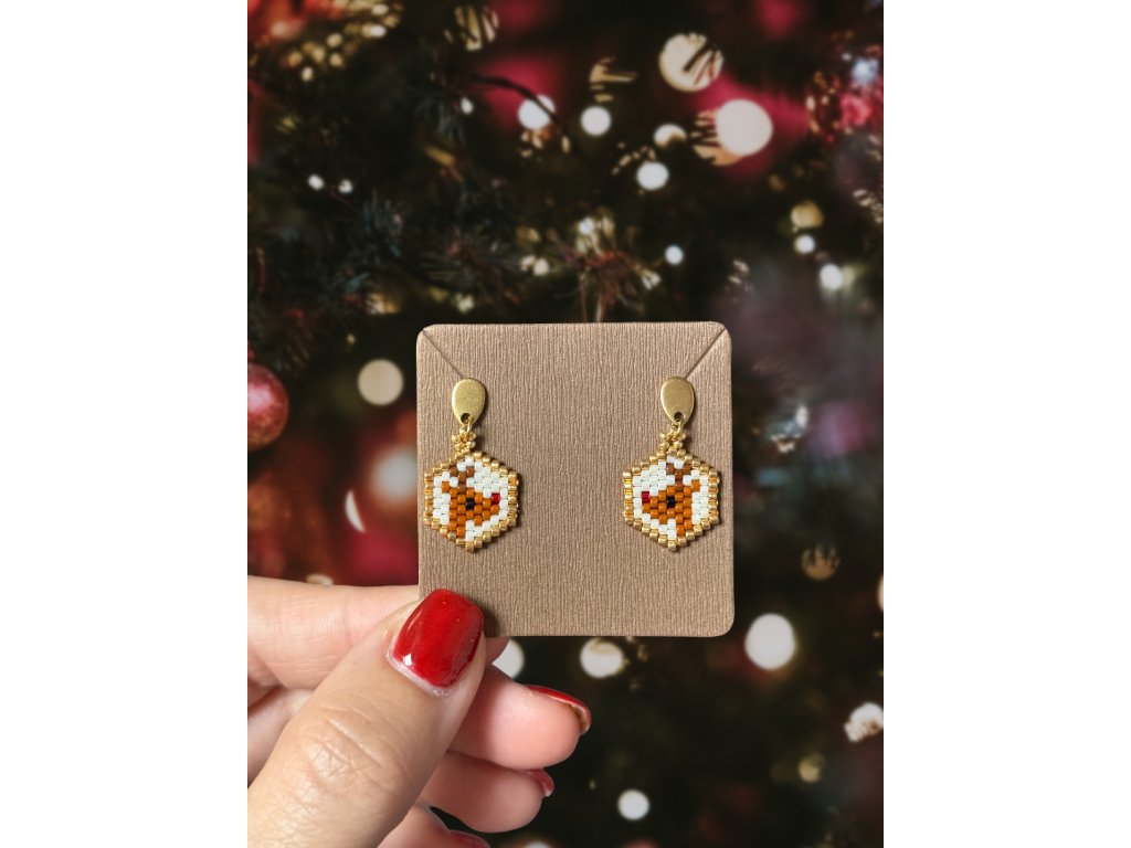 Ručně šité náušnice s motivem roztomilých sobů s červeným nosem přinášejí do každého dne jemnou dávku vánoční magie. Detailní zpracování v béžovém poli se zlatým rámečkem dodává náušnicím elegantní a hřejivý vzhled — jako z pohádky o Vánocích.