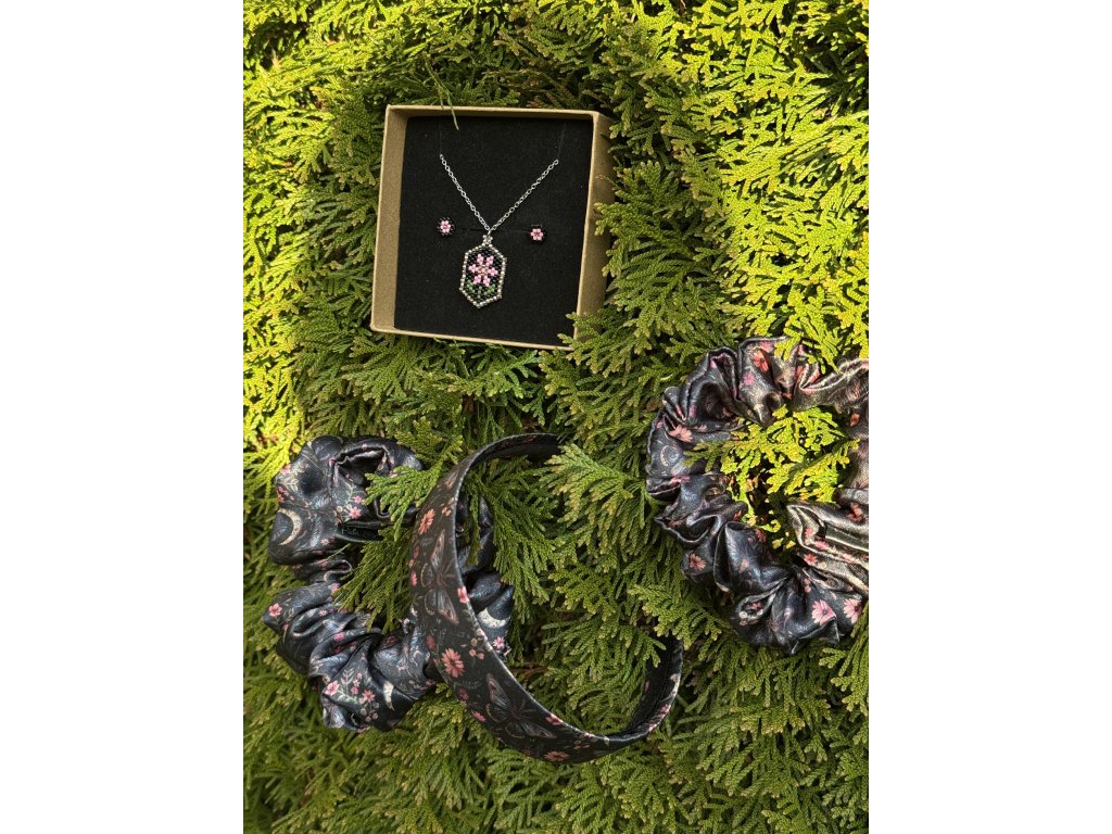 - dokonale sladěný design — látka s ilustracemi doplněná o korálkové šperky ve stejném motivu